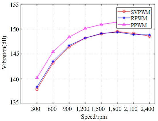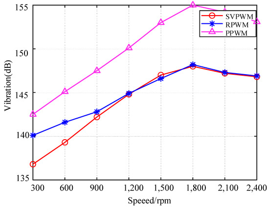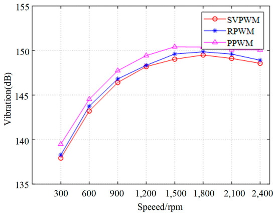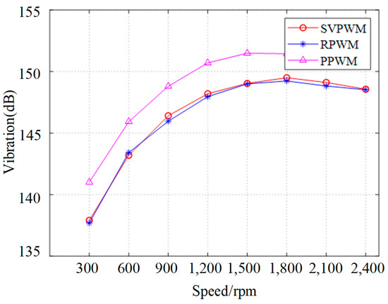 When the carrier frequency range is expanded from 7.8 kHz~8.2 kHz to 7.5 kHz~8.5 kHz, the total vibration level can be shown in Figure 18. The total vibration levels of the motors under the three PWM strategies exhibit a trend of initially increasing and then gradually decreasing with rising rotational speed. Notably, the total vibration level is highest for the PPWM technique. In contrast to the carrier frequency range of 7.8 kHz to 8.2 kHz, the total vibration level of RPWM is slightly greater than that of SVPWM at speeds between 300 and 900 rpm. However, at speeds exceeding 900 rpm, the total vibration levels of both RPWM and SVPWM are nearly identical. This similarity at higher speeds suggests that the characteristics of total vibration levels in the two frequency ranges are compatible.