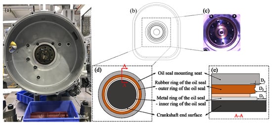 Oil seal assembly diagram. (a) Actual assembly drawing of oil seal, (b) simulated assembly drawing of oil seal, (c) close-up drawing of oil seal and crankshaft, (d) simulated drawing of main measurement part of oil seal, (e) simulated cross-sectional structure drawing of oil seal.