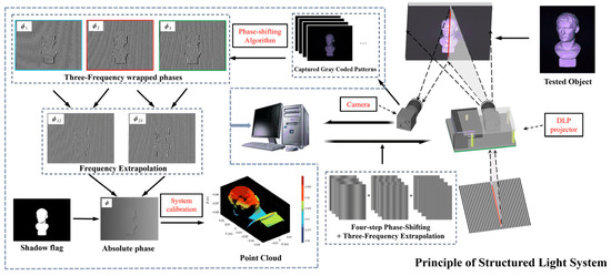 where , , , and represent the light intensity values when the phase shift step is , , , and , respectively. The projected image is captured by the camera, and then the wrapped phase modulated by the height information of the object can be obtained by Equation (4):