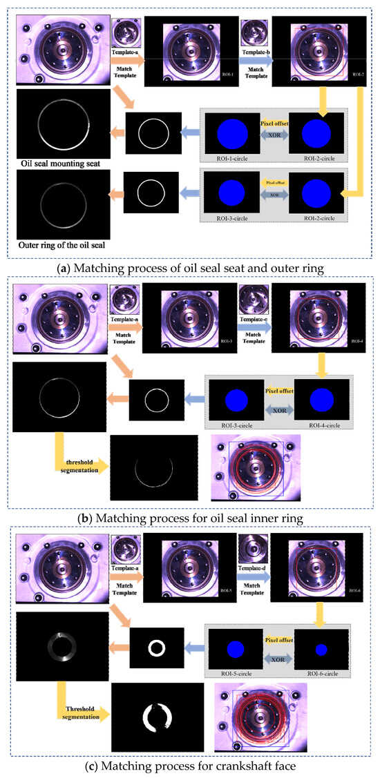 For the oil seal parameters to be inspected, four corresponding templates were created based on the actual captured images, as shown in Figure 4. These templates correspond to the outermost edge of the oil seal seat, the outermost edge of the oil seal outer ring, the outermost edge of the oil seal inner ring, and the outermost circular boundary of the crankshaft shaft end, respectively, which were used as matching regions to improve the accuracy of the matching results.