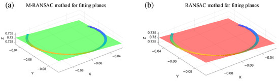 Among them, M-RANSAC’s running time is 0.0019 s, RANSAC’s running time is 0.0024 s, the mean plane distance for ordinary RANSAC is 0.3232 mm, and the mean plane distance for M-RANSAC is 0.2747 mm. The root mean square error is reduced to 0.0124 compared to conventional RANSAC. There is an improvement in the running speed, while better plane fitting results can be obtained.