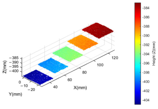 For the sensor reconstruction effect, a standard step block, as seen in Figure 9, was reconstructed in three dimensions, and a total of 10 measurements were made. The obtained point cloud is shown in Figure 10. The sensor height measurement accuracy is calculated by calculating the height difference between each small plane through point cloud fitting, and the results are shown in Table 4; the average error between stepped surfaces is 0.0203 mm and the RMSE is 0.0198 mm, meeting the measurement accuracy requirements.