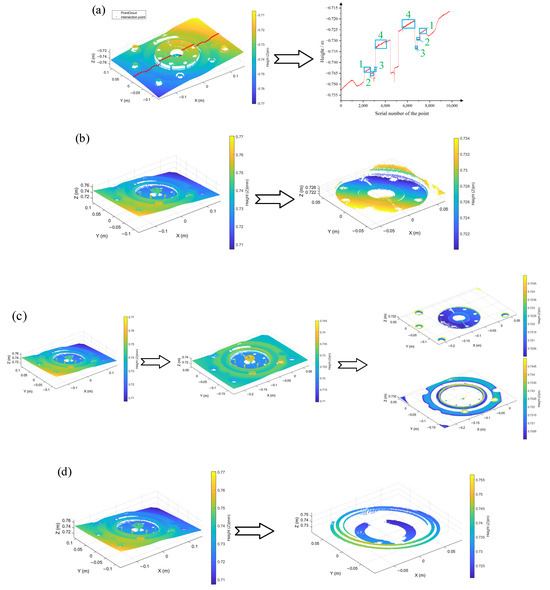 In Method I [14], after obtaining the point cloud information, a certain cross-section is selected for the acquired point cloud, and then the cross-section curve break is used as a gap feature according to the cross-section curve, and the gap size is finally obtained. Similarly, the sensors are arranged on the engine assembly line to be inspected, projecting preset structured light streaks, containing 1 streak-free map and 12 (three-frequency, four-step) streak maps. The overall 3D reconstruction of the internal region of the engine flywheel housing is performed using the acquired streak maps, and the complete point cloud obtained is shown in Figure 11a, with a reconstruction time of 17.655 s and a point cloud number of 118,001, where the red part is the cross-section intersection line between the Y = 0 plane and the complete point cloud. From the figure, it can be seen that due to a certain inclination of the camera, it is not possible to ensure that the camera axis is perpendicular to the surface to be measured, and therefore the obtained point cloud is not completely parallel to the XOY plane. The height information of the intersection line is shown in Figure 11a, and the regions 1, 2, 3, and 4 correspond to the four parts of the ROI, where it can be seen that if the localized height information has a larger error, for example, in the part of region c, where the point cloud is less, the error is larger when solving the height difference.