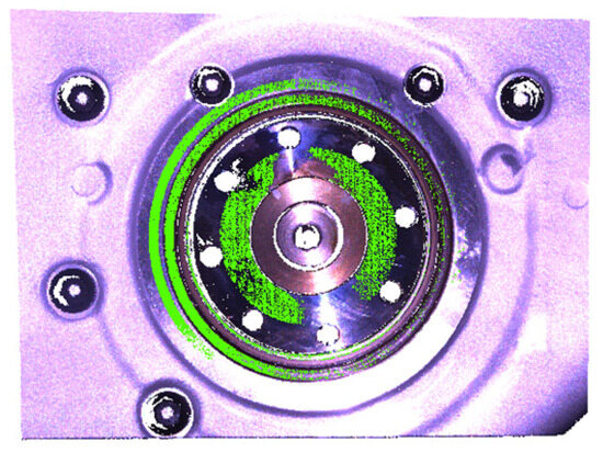 After obtaining the image with stripes based on the camera acquisition, the first image is processed to obtain the corresponding mask; continuing, the mask is applied to the other 12 images with stripes to obtain the final ROI, and its distance information is calculated. The four parts of the obtained point cloud and the overall point cloud are schematically shown in Figure 12, where the green part is the point cloud obtained by reconstruction after extraction. The numbers of point clouds for the oil seal seat PSeat, the oil seal outer ring POut, the oil seal inner ring PInner, and the crankshaft end face PEnd are 43,299, 8644, 53,947, and 66,186, respectively, and the reconstruction time totaled 8.575 s. Compared with the global reconstruction, the reconstruction time was shortened by 51.4% due to the significant reduction in the number of point clouds, which significantly improved calculation speed.