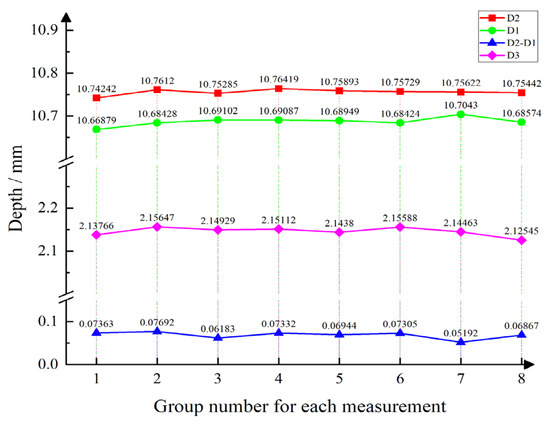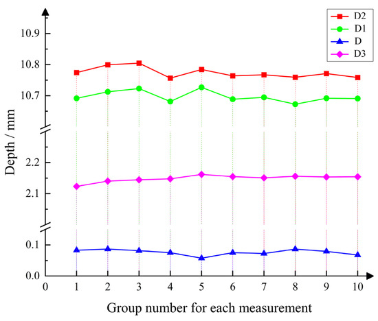 (1) The first group is the sensor assembly reliability experiment. The experimental process is repeated disassembly of the sensor, using the same calibration parameters, and the same engine for the oil seal assembly size measurement. Repeated disassembly experiments are conducted on the sensors mainly to evaluate their assembly stability during repeated disassembly and reassembly, because the sensors may be affected by external shocks, pressure changes, loose electrical connections during disassembly, etc. Repeated disassembly experiments help to confirm whether the sensors can continuously maintain a stable working condition. The mean values of heights D1, D2, D, and D3 obtained from measurements taken by specialized workers were 10.65 mm, 10.70 mm, 0.05 mm, and 2.10 mm, respectively. The experimental data obtained are shown in Figure 13 and Table 7.