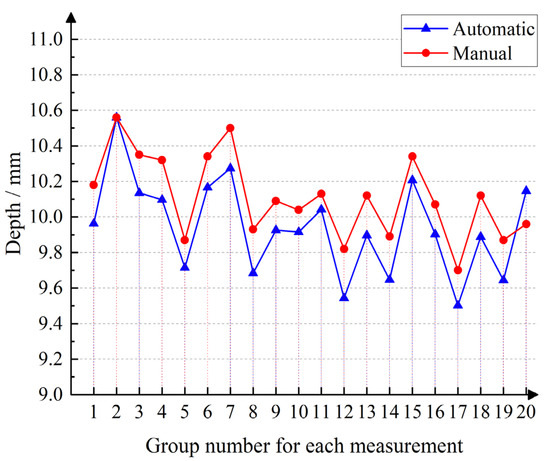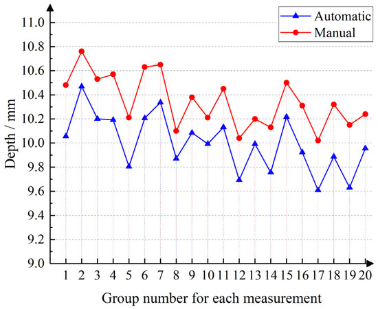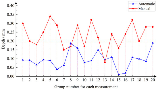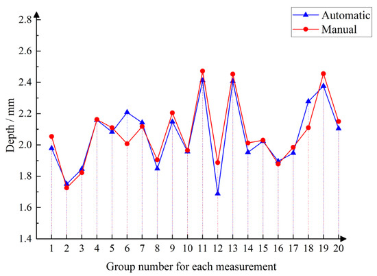 Matching results are shown in Figure 16, and the results of the statistics are shown in Figure 17 and Figure 18. The distance from the inner and outer rings of the oil seal to the end face of the crankshaft was measured, and it can be seen that when comparing the automatic measurement with the manual measurement, the measured value is small, and the height change trend remains the same. In Figure 19, it is evident that manual measurement involves significant subjectivity. On the assembly line, the number of measurements meeting the 0.2 mm assembly requirement should account for more than 98%, whereas the automatic measurement values are more stable. Figure 20 shows the comparison of D3 automatic measurement and manual measurement data, where it can be seen that the trend of manual measurement and automatic measurement is consistent, which again verifies the reliability of this testing method.