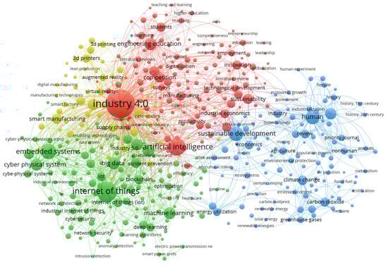 The most dominant research cluster we observed is Industry 4.0, a central theme connecting multiple domains such as smart manufacturing, supply chains, digitalization, education and training, and augmented reality. Closely linked to this is the cluster focusing on AI and IoT, which includes machine learning, deep learning, blockchain, cybersecurity, and cyber-physical systems, which highlights the role of AI-driven automation in industrial transformations. An emerging presence of Industry 5.0, positioned between these two major clusters, suggests a gradual shift from pure automation towards more collaborative interactions between humans and AI systems. The third major cluster emphasizes sustainability and societal impacts, placing humans at the core. This cluster includes critical topics such as sustainable development, climate change, circular economy, and economic growth. This reflects the increasing emphasis on balancing technological progress with environmental and social responsibility. The visualization also highlights historical and economic dimensions of industrial revolutions through keywords history, economics, energy, agriculture, and that indicates the current research extends beyond purely technological aspects.