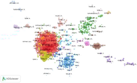 Similarly, we generated a bibliometric author network (Figure 2) which highlights the prominent researcher collaborations and thematic groupings in the industrial revolution literature. Here, several distinct, interconnected clusters were identified and represented by a specific color. As shown in the large, densely connected red cluster, which identifies a core group of highly influential authors who frequently collaborate within their robust collaborative network. Smaller clusters of various colors (such as blue, green, and purple) reflect additional researcher groups, likely indicating regional or thematic specializations (e.g., agriculture, energy, history, biasness, economics). Additionally, the presence of smaller or isolated clusters suggests emerging research topics or specialized areas that are currently peripheral but may represent promising directions for future research.