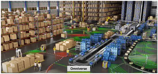 The concept of digital twins was once considered science fiction, but it is now a reality with many real-world applications. Digital twins essentially generate virtual replicas reflecting physical entities, processes, and systems. This digital replica is interconnected with physical systems in real-time through sensors and datasets to perform simulation, analysis, and optimization tasks of the process by utilizing Cyber-Physical Systems (CPS) concept [32]. Rather than relying on theoretical models or best-guess estimates, both virtual and physical entities can pull in large amounts of real-time actual sensor or simulated data and allow engineers to experiment with new configurations to predict potential breakdowns in a no-risk virtual sandbox. This dual reality not only reduces the time and cost typically associated with iterative prototyping but also creates a feedback loop that continuously refines itself and increases efficiency and resilience [33]. For instance, in the automotive manufacturing process, such twins assess new materials, compositions, production methods, and innovation. In the production aspect, such twins can optimize processes by monitoring real-time data, detecting insufficiency, and predicting potential failure by comparing them with the standard virtual twin. NVIDIA, one of the leaders in this field of digital twin architecture, recently introduced “Mega”, a blueprint within the Omniverse designed to help develop, test, and optimize AI and robotic fleets on a large scale in a digital twin environment before any real-world implementation [34]. Advanced warehouses and factories are now using extensive virtual fleets of autonomous mobile robots (AMRs), robotic arm manipulators, and humanoid robots working alongside human operators [35] for testing and validation before implementation (Figure 3). This demands thorough simulation-based training to streamline operations, enhance safety, and reduce interruptions. Such a continuous data acquisition environment provides a manufacturing process with automated derivation of optimization measures and parameters [36]. Moreover, remote control has emerged as a significant application in manufacturing, defense, and healthcare. It can lower non-value-added transportation costs and ensure acceptable safety in systems where local access is limited and hazardous [37].