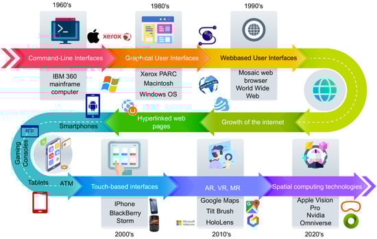 From the early command line interface to graphical user interfaces, to smartphones, and now to modern immersive technologies, the ways in which humans interact with technology have been continuously redefined throughout history [126] (see Figure 6). The latest generation of user interfaces, driven by advancements in spatial computing, is now commercialized through AR, VR, and MR products, enabling more seamless and intuitive interactions between humans and machines [127]. Spatial computing bridges the digital and physical worlds, integrating VR, AR, or even AI-powered MR to create real-time, adaptive environments. With capabilities such as spatial mapping, sensory integration, and computer vision, immersive technologies are evolving beyond static visualization tools into interactive, human-centric systems to facilitate collaboration, cognition, and decision-making. During IR4.0, the primary focus of VR and AR systems was on visualization and efficiency in gaming and training. However, as IR5.0 shifts toward deeper human–machine collaboration, technologies embedding affective computing to interpret cognitive and emotional states emerge. Immersive tools are no longer just static interfaces but adaptive instruments that respond dynamically to user engagement and environmental factors, offering multifaceted use cases [128]. This transition is particularly evident in industrial and manufacturing applications. Modern AR and VR systems are now used not only for design, training, and maintenance but also for real-time decision support. Such solutions expedite “virtual commissioning”, allowing companies to simulate and optimize factory layouts before physical implementation. As IR5.0 unfolds, XR is now integrated into live operations; it not only supports training and remote assistance but also collaborative design sessions, and it empowers front-line operators with context-specific insights [129]. Going beyond, AR headsets bring context-specific, key data into the operator’s field of view. In DHL warehouses, these wearables have reportedly improved picking processes by 25% [130]. Likewise, smart safety vests Elokon offers use real-time tracking to slow or halt machinery when workers enter hazardous zones [117]. Additionally, XR solutions now offer real-time visual cues, interactive work instructions, and remote expert guidance, ensuring that technology adapts to humans rather than the other way around. The shift from passive visualization to dynamic human–machine collaboration marks a defining characteristic of the IR5.0 revolution.