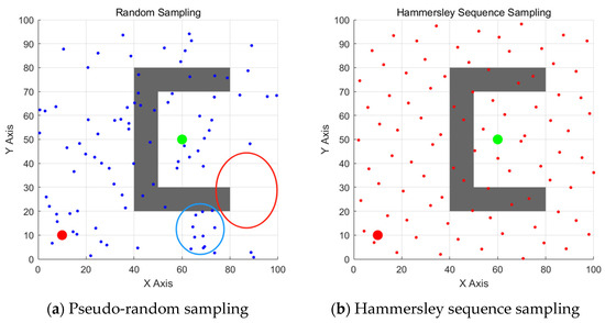 Research [26] indicates that Hammersley sequence sampling is an effective low-variance sequence sampling method that demonstrates superior point distribution uniformity in multidimensional spaces, effectively avoiding the point clustering and gap issues common in traditional Monte Carlo sampling. This uniform distribution characteristic not only ensures effective sampling in key regions but also prevents sampling point clustering, thereby enhancing the algorithm’s ability to break through complex regions while reducing computational overhead and improving path planning efficiency. This structured sampling method forms a complementary optimization with the heuristic search: while ensuring directional path exploration, it effectively eliminates the blind spots of random sampling through comprehensive spatial coverage characteristics, thereby achieving synergistic improvement in algorithm convergence speed and solution quality.
