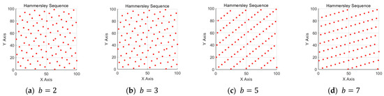 It is worth noting that the base is one of the key parameters for generating Hammersley sequence sampling points, which directly affects the distribution characteristics of the sequence in specific dimensions. Each dimension corresponds to a cardinal number, usually a prime number (such as 2, 3, 5, etc.). The choice of base has an important influence on the uniformity of point distribution and the coverage of multidimensional space. In the two-dimensional space of a 100 m × 100 m map, 100 points are generated by using prime numbers 2, 3, 5, and 7, respectively, and the distribution of observation points is observed.