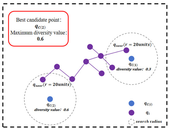 Principle of diversity value: illustration showing how the candidate point farthest from the nearest tree node () within the search radius is selected as the sampling point () when considering only the diversity value indicator.