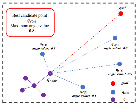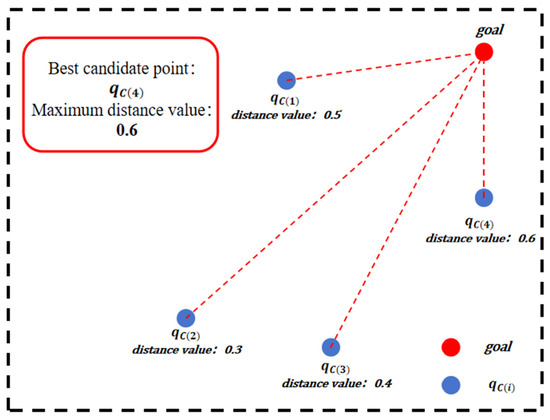 As shown in Figure 4, when only the distance value is considered, the candidate point with the smallest Euclidean distance from will be selected, which is , the final sampling point. The distance value ensures that the sampling point moves in the direction of the target.