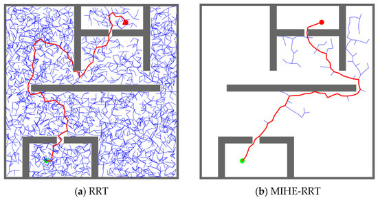 The planning effect of the RRT algorithm and the path planning effect of the MIHE-RRT algorithm: (a) RRT algorithm showing extensive exploration with numerous nodes (blue dots) and a longer path (red line) from start point (green dot) to target point (red dot); (b) MIHE-RRT algorithm demonstrating more efficient planning with fewer nodes and a shorter path, while successfully navigating through the same environment.