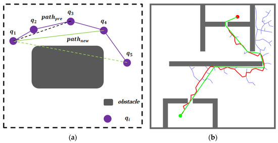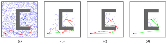 The initial path generated by the RRT algorithm is formed by connecting randomly sampled points with straight lines, which typically contain redundant nodes and unnecessary turns. In order to improve path efficiency, it is necessary to optimize and simplify it.