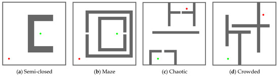 Four types of maps for simulation testing: (a) Semi-closed environment with a narrow pathway surrounded by obstacles, designed to test the algorithm’s ability to escape dead zones; (b) Maze environment with continuous narrow passages and multiple dead ends, testing navigation capabilities in constrained spaces; (c) Chaotic environment with irregularly distributed obstacles, examining adaptability to complex spatial structures; (d) Crowded environment with multiple obstacles creating narrow passages between them, challenging the algorithm’s efficiency in multi-objective scenarios. In all maps, the green dot represents the starting point and the red dot represents the target point, with obstacles shown in brown.