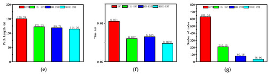 Simulation results and statistical results (Map 1): (a) Path planning result of RRT algorithm; (b) Path planning result of IBi-RRT algorithm; (c) Path planning result of HB-RRT algorithm; (d) Path planning result of MIHE-RRT algorithm; (e) Comparison of path length; (f) Comparison of computation time; (g) Comparison of number of nodes.