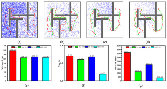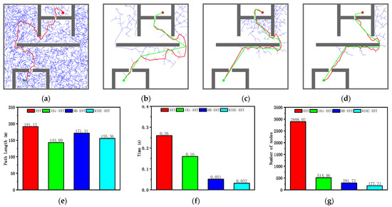 Simulation results and statistical results (Map 4): (a) Path planning result of RRT algorithm; (b) Path planning result of IBi-RRT algorithm; (c) Path planning result of HB-RRT algorithm; (d) Path planning result of MIHE-RRT algorithm; (e) Comparison of path length; (f) Comparison of computation time; (g) Comparison of number of nodes.