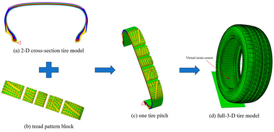 Secondly, the single-pitch 3D tread pattern solid model is established using the CATIA 2017 software and imported into the HYPERMESH 2019 software to generate the 3D mesh, as shown in Figure 1b. Considering the incompressibility of rubber materials, the corresponding grid type is the hybrid element C3D8RH [17]. Fit the single structure tread pattern model using the tie command to form a sector tire model with 6°. Finally, the 3D tire model, including the complex tread pattern, is shown in Figure 1d, with 123,842 elements and 155,703 nodes, generated using the keyword *SYMMETRIC MODEL GENERATION.