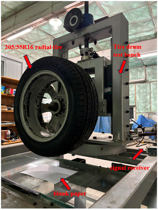 To verify the accuracy of the tire finite element model established, the results were verified using the tire static ground contact distribution characteristics test and tire radial stiffness test. The tire static ground contact test was performed using tire drum testing machine, as shown in Figure 2. During the test, the tire was loaded to a rated load of 3800 N, and the inflation pressure of 210 kPa was selected based on the tire manufacturer’s rated specifications for passenger vehicles under standard loading conditions. The additional 250 kPa case was included in our analysis. The wear of the test tire is 0, the environmental stability is 25 °C, and the pavement roughness is negligible. These conditions are consistent with the simulation conditions of steady rolling in the finite element simulation. The ground contact patch of the tire under static loading was obtained through red ink printing, and the ground contact geometric parameters were extracted, as shown in Figure 3. Table 2 shows that the error between the tire contact sizes obtained by finite element simulation and the test result are less than 2%, which has a high accuracy, indicating that the tire finite element model established in this paper can accurately describe the tire ground contact characteristics.