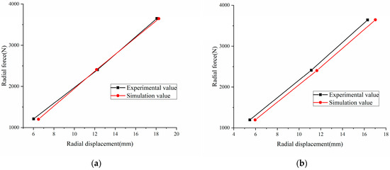 Comparison of tire radial stiffness under different inflation pressures: (a) 210 kPa and (b) 250 kPa.