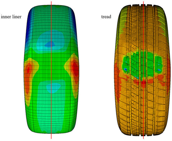 The content in the previous section determines the estimation method of the contact angle of rolling tires; the finite element analysis method was used to simulate the rolling tires with slip rates of 0, 0.02, 0.04, 0.06, 0.08, and 0.1; the load is 3800 N; the inflation pressure is 210 kPa; and the road friction coefficient is 0.5.