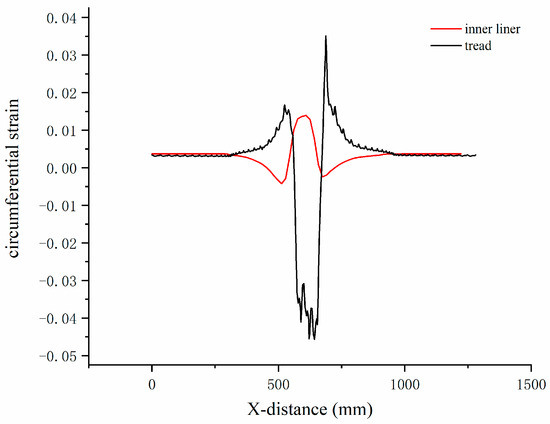 The selection of intelligent tire sensors mainly includes three-axis accelerometers, strain sensors, optical sensors, and others [19]. Strain sensors offer advantages such as high precision, wide measurement range, fast response, durability, reliability, and ease of installation and integration. Compared to accelerometers, the signals from strain sensors are less susceptible to interference from tire noise. Based on the previous research conducted by the research team on the force-sensitive response regions of tires, it was found that, under braking conditions, the deformation caused by the contact between the tire and the ground primarily occurs at the tread. Therefore, in steady-state rolling simulation analysis, with the highest point of the rolling tire as 0 point, the circumferential strain signals of the centerline of the tread and the centerline of the inner liner are extracted, respectively, by rotating for one cycle. Comparative analysis of circumferential strain signal characteristics of tread centerline and liner centerline is as shown in Figure 5. The abscissa represents the distance of the nodes around the tire during one revolution, while the ordinate represents the circumferential strain signal. According to Figure 6, it can be found that the tread pattern significantly influences the circumferential strain signal at the tread centerline, resulting in large fluctuations in the signal, which are particularly evident at the signal’s troughs. This fluctuation hinders the effective extraction of sensitive signal features.