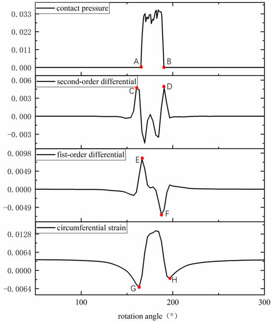 This trend is consistent with the experimental results in Reference [21]; the characteristic angle of the circumferential strain’s first and second derivative curves is selected as the characterization index of the contact angle, as shown in Equation (4).