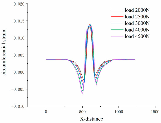 To further analyze the characteristic angles of rolling tire circumferential strain signals, with other tire parameters unchanged, simulation analyses were carried out using finite elements for load conditions of 2000 N, 2500 N, 4000 N, and 4500 N, respectively. Circumferential strain signals were acquired at the midline of the inner liner within the tire contact patch, and the contact angle was simulated, as shown in Figure 8. It was found that the two troughs of the circumferential strain signal increased with increasing loads, and the angular difference between the two troughs increased; this is due to the increased load, increased deformation of rolling tire treads, and the contact angle between the tire and the ground increases. The absolute values of the signals on both sides of the peak also increase with increasing load. However, the circumferential strain signal at the center of the rolling tire–road contact zone decreases with increasing load because the tire has “buckled” [22,23]. The fluctuation of the peak signal is due to the presence of the tire tread pattern; since the extracted signal characteristic value is the angular difference between two troughs, the signal fluctuations of the peaks do not affect the estimation of the rolling tire contact angle.