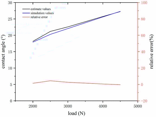 Equation (2) was used to estimate the contact angle between a rolling tire and the ground, compare the estimated and simulation values of the contact angle, and describe the estimation accuracy of this method in terms of relative error. The results are shown in Figure 9. The maximum difference between the estimated and simulated contact angle is about 1°, and the maximum relative error of estimation is not to exceed 5%; it was verified that the contact angle estimation method is feasible.