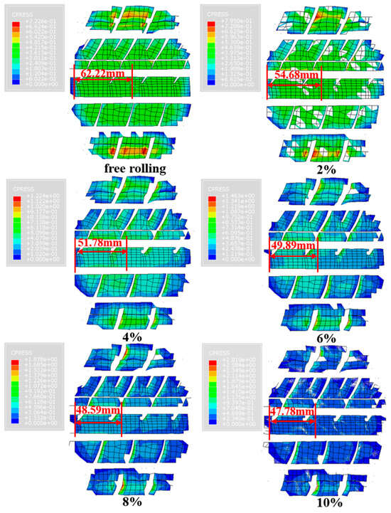 Figure 10 shows the contact patch of the rolling tire under different slip rates. It can be seen that the front and rear contact angles are equal when free-rolling. When the tire begins to slip, the position of the midpoint of the tread in the finite element simulation starts to move forward, and the front contact angle decreases with the increase in slip rate; and the rear contact angle increases with the increase in slip ratio, an increase in asymmetry of contact angle. When the tire is at a high slip rate, the increasing trend of asymmetry of contact angle becomes slow; this is consistent with the results of Reference [24]. Therefore, the assumption that the front and rear contact angles of tires are equal cannot be used to estimate the contact patch length during braking. Using the arc length formula relative to the trigonometric function does not allow us to distinguish the size of the front and rear contact angles; it is more suitable for estimating the contact patch length of rolling tire during braking. The estimation formula of contact patch length is shown in Equation (5).