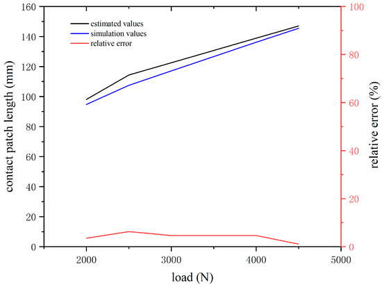 Figure 11 shows the estimated contact patch length of the rolling tire under different loads, compared with the simulation value of contact patch length obtained by finite element simulation. It can be seen that the length of the arc is greater than the length of the straight line, the estimated contact patch length is larger than the simulation result, and the relative error exceeds 6%. When rolling tires under low and high load conditions, the error between the estimated value and the simulated value is small, and it is greater at moderate loads. In order to reduce the error of the estimated contact patch length, we define a correction factor β to eliminate the length difference between the arc length and the straight line, as shown in Equation (6).