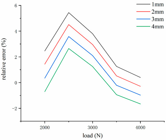 To determine the value of the correction factor, β, values of β were chosen as 1 mm, 2 mm, 3 mm, and 4 mm to calculate the relative error in the contact patch length for each correction factor, as shown in Figure 12. It can be observed that as the value of β increases, the estimation accuracy of the contact patch length improves. However, at higher and lower loads, the relative error of contact patch length estimation first decreases and then increases. When the tire is under extreme conditions of low and high load, the safety requirements of the vehicle are higher, so the active safety control system of the vehicle needs more accurate input. The contrast correction factors are 1 mm, 2 mm, 3 mm, and 4 mm; the average relative error under lower and higher loads was found to be 0.63% at 3 mm; and 0.63% at 1 mm, 2 mm, and 4 mm were 1.43%, 0.865%, 1.18%, respectively. After considering the overall performance for different values of β, a correction factor, β, of 3 mm was selected.