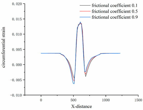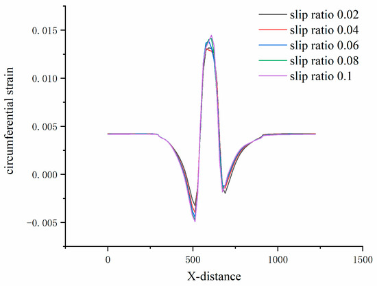 The circumferential strain signals of the tread centerline of rolling tires at slip rates of 0, 0.02, 0.04, 0.06, 0.08, and 0.1 were extracted by finite element simulation, as shown in Figure 15. The load is 3800 N, the inflation pressure is 210 kPa, and the road friction coefficient is 0.5. With the increase in slip rate, the absolute value of the strain signal trough at the front end of the contact patch increases; it moves forward slightly, and the absolute magnitude of the trough of the strain signal at the back end is unchanged [26]. It can be concluded that rolling tires during braking and other conditions remain unchanged, and the change in slip rate has little effect on tire contact angle. However, the asymmetry between the left and right sides will increase with the increase in tire slip rate. The valley value of the circumferential strain signal peak increases with the slip rate increase; however, when the tire reaches 6% slip condition, the valley value changes slightly, which mainly affects the distribution of the strain signal.