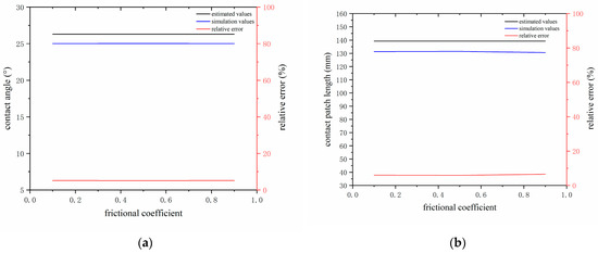 Estimated and simulated values of grounding parameters under different road friction coefficients: (a) contact angle and (b) contact patch length.
