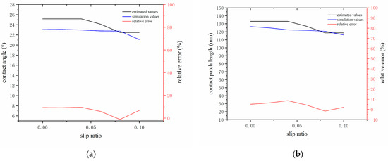 Figure 16 shows the estimated and simulated contact angle and contact patch length values under different slip rates and relative errors. The estimated value of the contact angle is generally significant. However, the maximum relative error is less than 10%, the maximum difference between the estimated contact angle and the simulated value is about 2°, the maximum relative error between the estimated and simulated contact patch length is 8.68%, the minimum error is 1.14%, and the average error is not more than 5%.