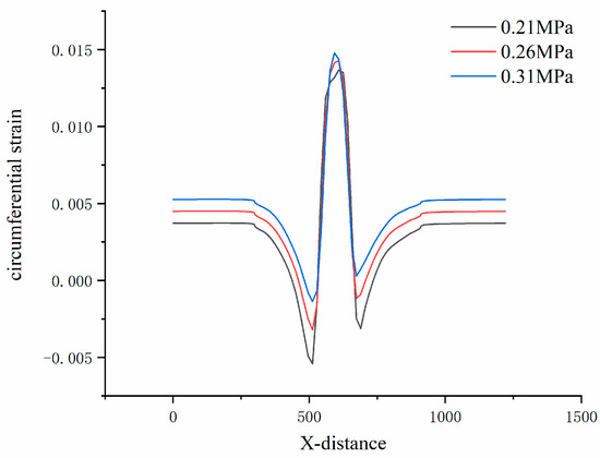 Through finite element simulation, the circumferential strain signals of the rolling tire under the conditions of inflation pressure of 210, 260, and 310 kPa during braking were extracted. The load is 3800 N, the road friction coefficient is 0.5, the slip rate is 8%, and the tire wear is 0 mm, as shown in Figure 17. It can be seen that the absolute value of the trough at the front of the contact patch of the rolling tire decreases with the increase in inflation pressure, and the peak value of the back end wave decreases with the increase in inflation pressure. The difference between the two troughs is also affected by inflation pressure, and the peak value of circumferential strain signal increases with the increase in inflation pressure [27].