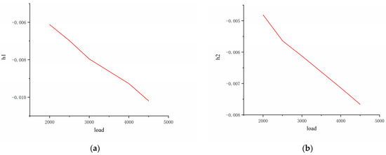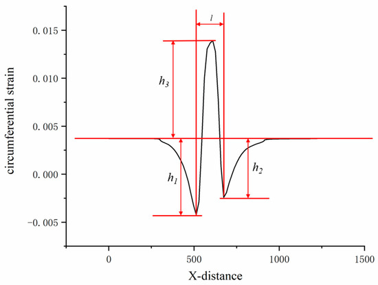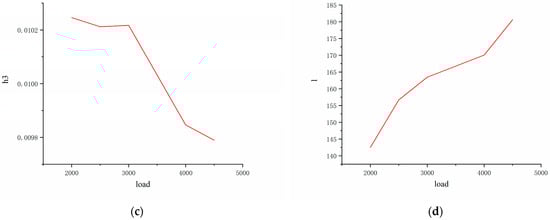 According to the analysis results of sensitive response signals under different loads, select the circumferential strain signal of the centerline of the inner liner of the rolling tire for feature extraction, as shown in Figure 19. The two troughs, h1 and h2, of the circumferential strain signal; the distance, l, between the two troughs; and the peak of the wave, h3, were selected. Feature extraction and analysis of circumferential strain signals in the medial line of tire inner liner under different loads with inflation pressure 210 kPa, slip rate of 0.08, and tread wear of 0 mm were performed by combining finite element simulation. We plotted the relationship between characteristic values and loads as shown in Figure 20.