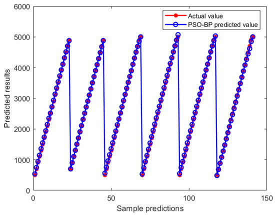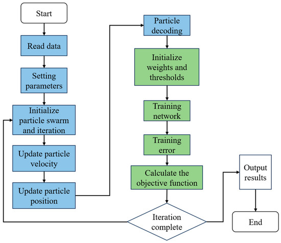 BP neural networks have easy applicability to nonlinear modeling, advantages of better fitting ability for complex input–output relationships, and the ability to improve the fitting ability and accuracy through multi-layer networks [30]. However, it also tends to fall into local optimal solutions, is computationally intensive, takes a long time to train, and is sensitive to the initial weights, which disadvantages the need to find a suitable initialization method. Therefore, in this paper, by combining the particle swarm algorithm and BP neural network, the weights and biases of the neural network can be optimized effectively; this solves the problem that the gradient descent method in traditional BP neural networks may fall into local optima. PSO-BP optimization algorithm uses particle swarm optimization algorithm to find the optimal neural network parameters, and these parameters are used to replace the weight adjustment steps in the traditional gradient descent method training process. The algorithm calculation process is shown in Figure 22.