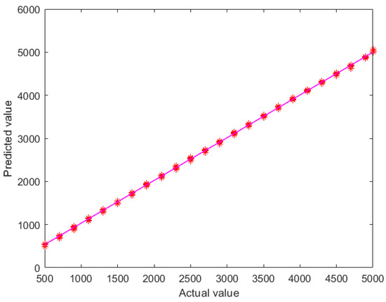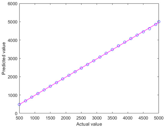 Figure 24 shows the training effect of the BP neural network vertical force prediction model based on particle swarm optimization. In the figure, the abscissa represents the actual value, and the ordinate represents the predicted value. The red symbol in the figure represents the data corresponding to the actual values and predicted values, while the pink line is used to show how the predicted values are distributed and trending overall. The red straight line is close to 45°, with almost no error. The determination coefficient, R2, and root mean square error, RMSE, are the error evaluation indexes of the model output, where the closer the coefficient of determination is to 1, the closer the model’s predictions are to the actual values and the better the fit. Conversely, the smaller it is than 1, the worse the model’s predictions are. The training set coefficient of determination, R2, of the vertical force prediction model is 0.99962, and the root mean square error, RMSE, is 26.3678; thus, the model is well-trained.