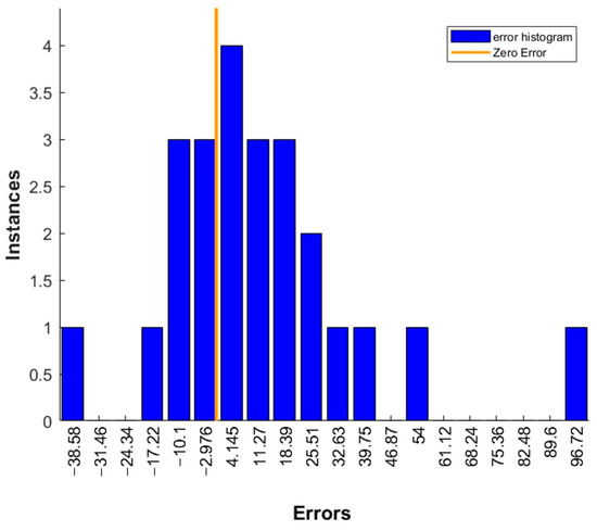 Input the collected 24 groups of data as test sets into the vertical force prediction model. Figure 25, Figure 26 and Figure 27 show the test set results comparison, prediction error histogram, and effect diagram of BP neural network vertical force prediction model based on particle swarm optimization. The error histogram shows the distribution of prediction errors on the test set; it is usually used to check whether there is a significant deviation between the predicted value and the actual value or whether it conforms to some specific distribution rules; if the error distribution is symmetrical, the error is evenly distributed in the positive and negative directions, and is close to zero, which indicates that the prediction result of the model is more accurate if the distribution of errors deviates. It also indicates that there may be some systematic errors in the prediction of the model, which may be higher or lower than the actual value. If the peak value of the histogram is high and concentrated near a specific error value, this shows that most of the error values are concentrated in this range, and the error of the model is relatively consistent; on the contrary, the error distribution is relatively scattered, indicating that the prediction error of the model is relatively scattered, and there may be inaccurate prediction on some samples. The horizontal coordinates in Figure 26 indicate the error values, and the vertical coordinates indicate the frequency of occurrence of each error value. It can be seen that the range of error is concentrated around the zero line, and the range of errors is also mainly concentrated within ±50 and is close to a normal distribution. It means that most of the predicted values are very close to the actual values, the prediction error is small, and the model performs well. It can also be seen that there is some bias in some samples, but the error size of the bias is also only 96.72. Finally, by analyzing Figure 27, the circle symbol in the figure represents the data corresponding to the actual values and predicted values, while the pink line is used to show how the predicted values are distributed and trending overall. We can see that the test set predicted values and the actual values match each other, the test set coefficient of determination R2 of the vertical force prediction model is 0.99955, and the root mean square error RMSE is 29.1858; thus, the model is well trained.
