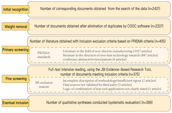 This study adopts a three-stage structured data collection method to systematically review the research context of lean technologies in the discrete manufacturing field. In the first stage of data identification, a compound search query was constructed based on the Web of Science Core Collection database, using key search terms such as “lean manufacturing”, “lean technologies”, and “lean technology in discrete manufacturing enterprises”. A search strategy was formulated by combining Boolean logical operators, resulting in the retrieval of 2421 original documents. The literature mainly originated from sources such as Elsevier, Springer, EBSCO Host Academic Search Premier, Inderscience, World Scientific, Academic Journals, and the American Society for Engineering Management. We conducted multiple rounds of data screening. Firstly, duplicate records (84 in total) were effectively eliminated through data cleaning and deduplication using COOC14.9 bibliometric software, ultimately yielding an initial sample of 2337 documents.
