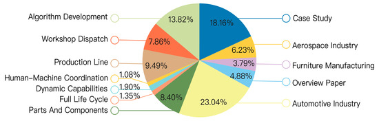 Moreover, journals with a higher volume of publications are included in Table 1. We plotted the annual publication volume and cumulative volume of the literature, as shown in Figure 2. We categorized the data by industry. Since 2020, the number of publications on lean technologies in the automotive industry (yellow line) has fluctuated significantly, while the number of publications in the aerospace industry (green line) has gradually declined since 2020. The number of publications in the furniture industry (red line) has remained relatively stable. Additionally, research related to case studies, the automotive industry, algorithm development, and production lines accounts for a larger proportion, while research on human–machine collaboration, dynamic capabilities, and the full life cycle accounts for the smallest proportion, as shown in Figure 3.