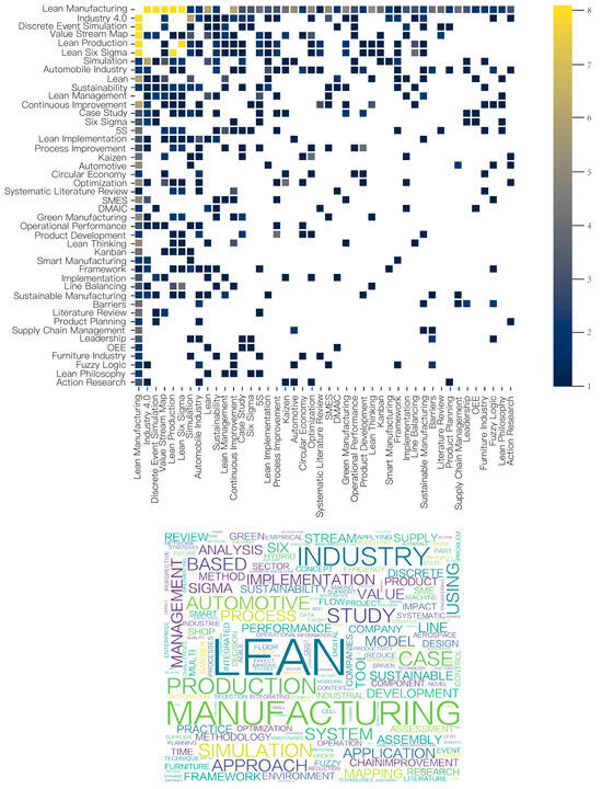 Furthermore, based on the visualization results, we created a title word cloud and a matrix diagram (Figure 4), which reveal that scholars primarily focus on areas such as lean manufacturing, Industry 4.0, Discrete Event Simulation (DES), Value Stream Mapping (VSM), lean product development, lean Six Sigma, simulation, the automotive industry, and continuous improvement. In contrast, research on lean philosophy, behavioral studies, fuzzy logic, and the furniture industry is less prevalent.
