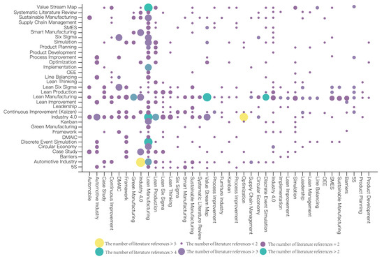 Subsequently, we further utilized the keywords from the articles to create a confusion bubble chart (as shown in Figure 5) to analyze the co-occurrence of these keywords. The chart indicates that research related to lean manufacturing frequently involves topics such as Value Stream Mapping, sustainable manufacturing, Six Sigma, simulation, continuous improvement, Industry 4.0, Kanban, Discrete Event Simulation (DES), circular economy, and the automotive industry. Topics associated with Industry 4.0 include optimization, Value Stream Mapping, lean thinking, lean Six Sigma, lean product development, and the automotive industry. DMAIC is often studied in conjunction with lean Six Sigma and serves as a common tool within this framework.