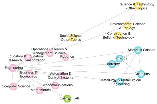 In the research direction clustering map (shown in Figure 6), we can discern that the research directions centered on engineering also encompass business economics, computer science, mathematics, management science, automation control systems, and telecommunications, while materials science-focused research involves physics, chemistry, and forestry.