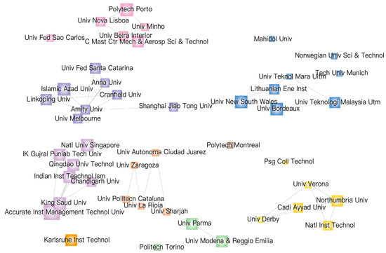 Based on the institutional clustering diagram (as shown in Figure 7), we can observe that IK Gujral Punjab Technical University, National University of Singapore, Accurate Institute of Management and Technology, King Saud University, and Indian Institute of Technology Kanpur have close ties among themselves. Similarly, the University of Federal Santa Catarina, Anna University, Cranfield University, Islamic Azad University, Linking University, and the University of Melbourne exhibit strong connections. Furthermore, the University of Nova Lisboa; the University of Minho; the University of Beira Interior; and the Centre for Maritime, Mechanical, and Aerospace Sciences and Technology form a tightly knit group. Lastly, the University of Derby, the National Institute of Technology, Northumbria University, Cadi Ayyad University, and the University of Verona also demonstrate close institutional links.