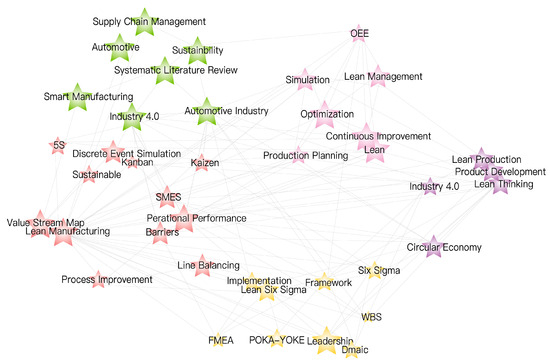 We conducted a visual analysis of the frequency of lean techniques and tools used in the literature, as shown in Figure 8. Value Stream Mapping (VSM) is often combined with Kanban, 5S, Lean Implementation, Discrete Event Simulation (DES), Sustainable Manufacturing, Lean Manufacturing, the Furniture Industry, Process Improvement, Line Balancing, and Barriers. Lean Six Sigma frequently associates with Leadership, DMAIC, FMEA, WBS, Implementation, and POKA-YOKE. Industry 4.0 is commonly linked with Product Development, Lean Production, Lean Thinking, and Circular Economy. Meanwhile, Industry 4.0 appears in a cluster associated with the Automotive Industry, which is often related to Sustainability, Supply Chain Management, and Smart Manufacturing. Finally, Simulation is typically associated with Optimization, Continuous Improvement, Overall Equipment Effectiveness (OEE), and Product Planning.