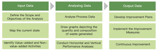 As a crucial tool in lean production, the Value Stream Map (VSM), also known as process mapping, plays a significant role in process visualization and cross-functional collaboration. It is a simple and user-friendly symbolic process modeling tool that specifies activities, cycle times, downtime, and delays, aiming to enhance efficiency by identifying bottlenecks and non-value-added activities in production or logistics [25,26,27]. The implementation steps of VSM are shown in Figure 9.